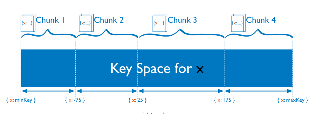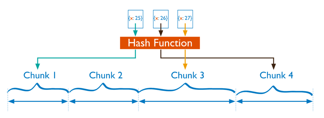 MongoDB 计算单个字段的哈希值作为索引值,并以哈希值的范围将数据拆分为不同的块(Chunk)。