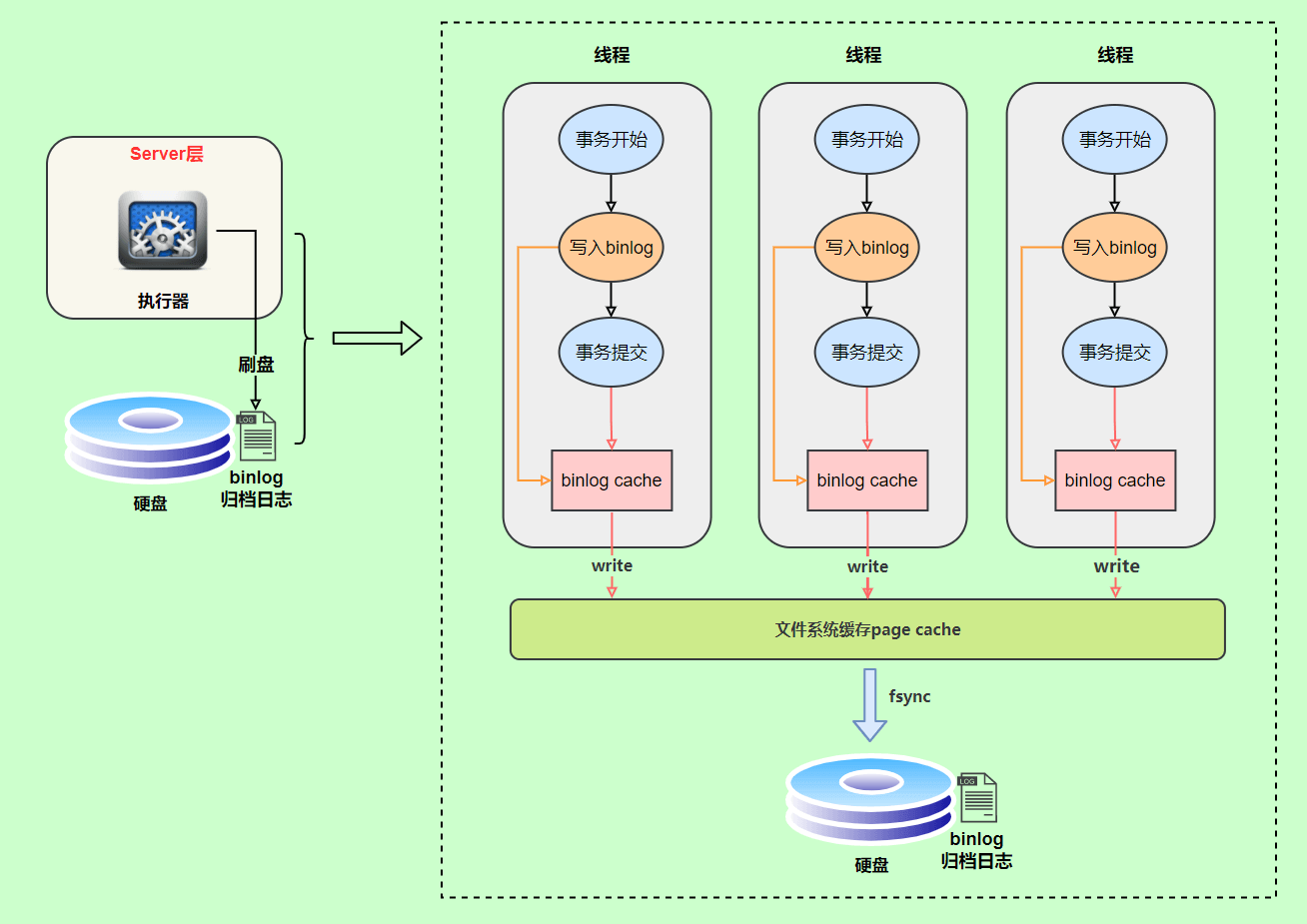 因为一个事务的 binlog 不能被拆开,无论这个事务多大,也要确保一次性写入,所以系统会给每个线程分配一个块内存作为binlog cache。