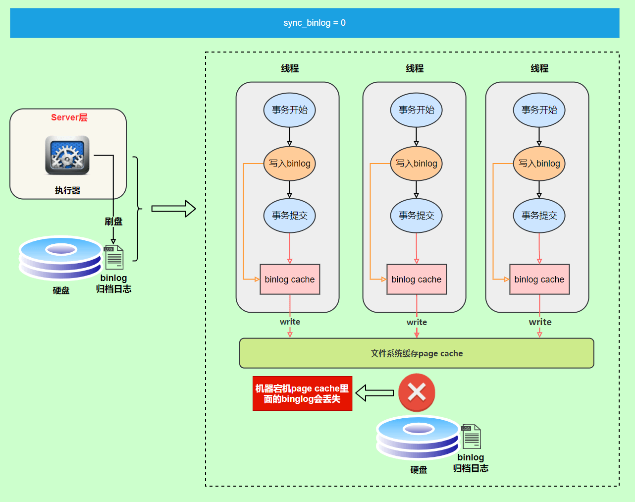 虽然性能得到提升,但是机器宕机,page cache里面的 binlog 会丢失。