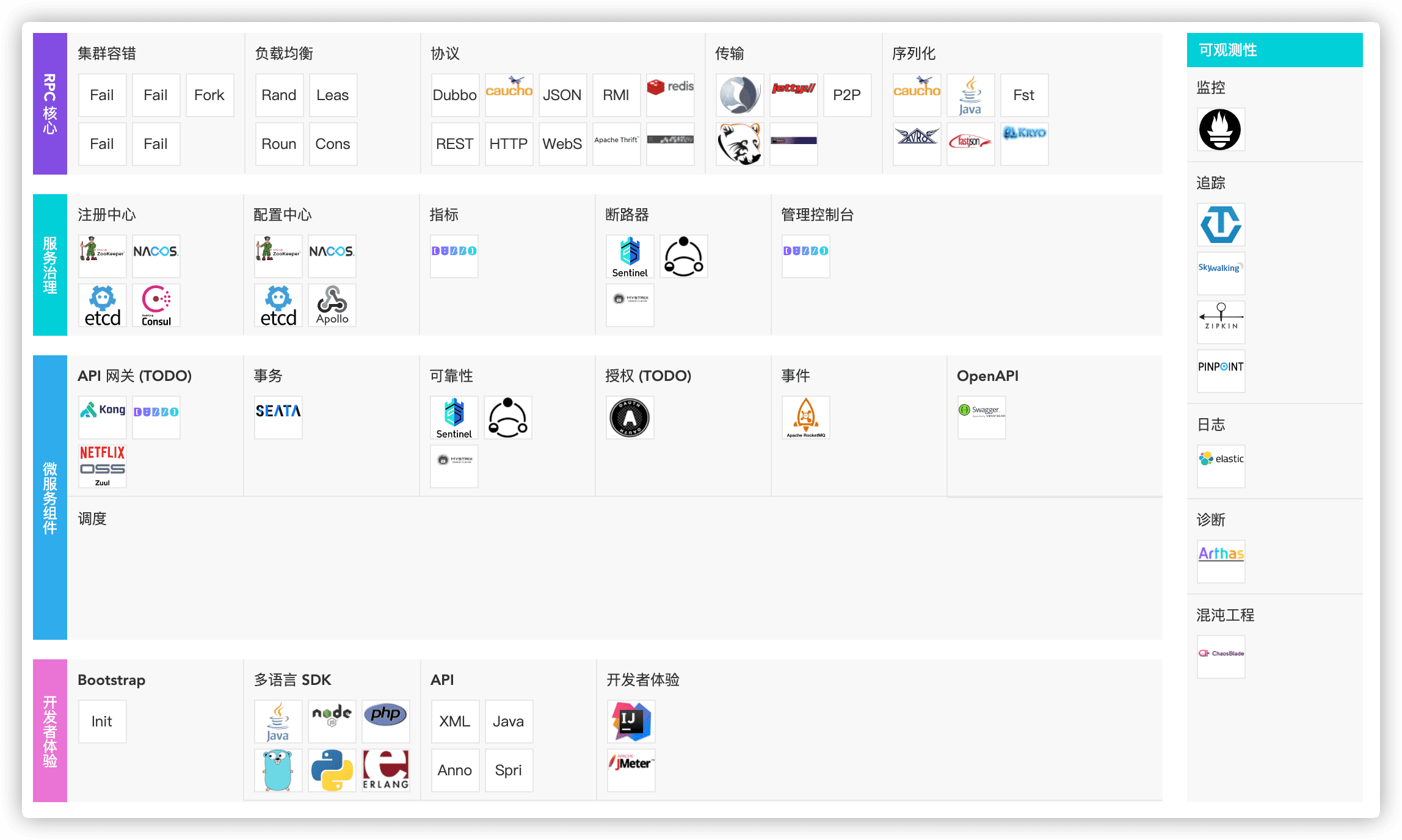 gRPC 和 Thrift 虽然支持跨语言的 RPC 调用,但是它们只提供了最基本的 RPC 框架功能,缺乏一系列配套的服务化组件和服务治理功能的支撑。