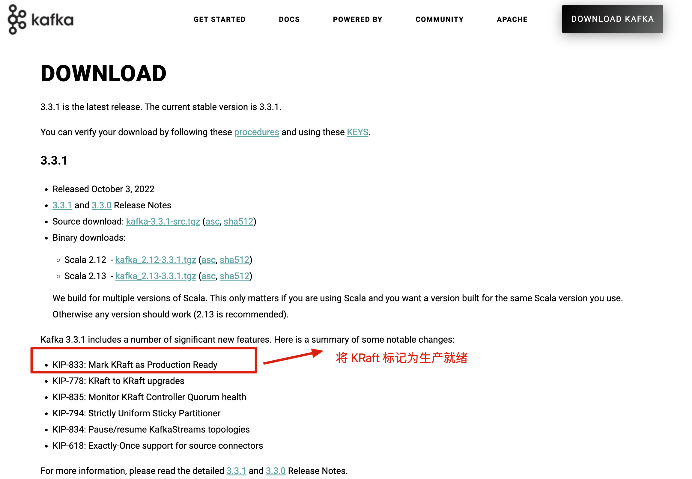 不过,要提示一下:如果要使用 KRaft 模式的话,建议选择较高版本的 Kafka,因为这个功能还在持续完善优化中。Kafka 3.3.1 版本是第一个将 KRaft(Kafka Raft)共识协议标记为生产就绪的版本。