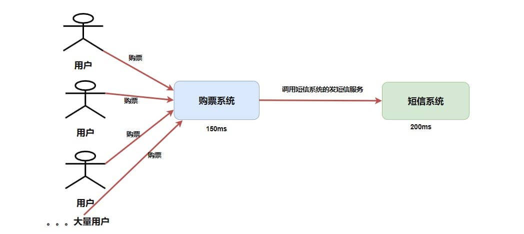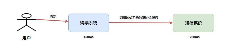 我们省略中间的网络通信时间消耗,假如购票系统处理需要 150ms ,短信系统处理需要 200ms ,那么整个处理流程的时间消耗就是 150ms + 200ms = 350ms。