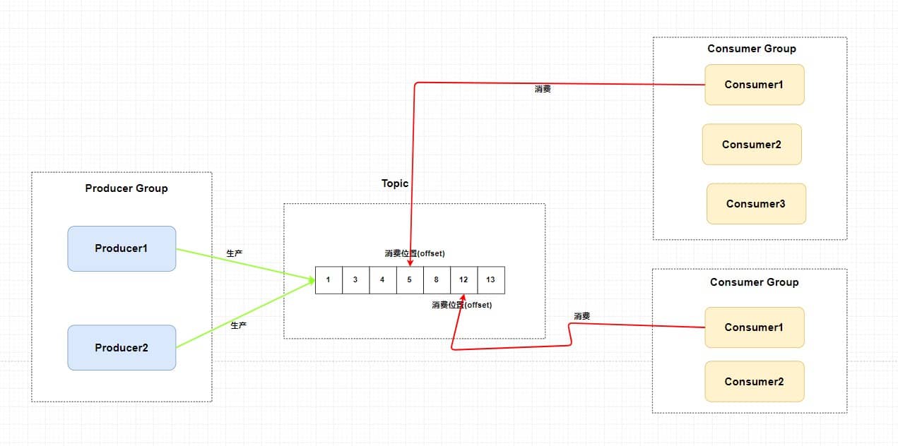 因为我们刚刚画的仅仅是一个消费者组,我们知道在发布订阅模式中一般会涉及到多个消费者组,而每个消费者组在每个队列中的消费位置都是不同的。如果此时有多个消费者组,那么消息被一个消费者组消费完之后是不会删除的(因为其它消费者组也需要呀),它仅仅是为每个消费者组维护一个 消费位移(offset) ,每次消费者组消费完会返回一个成功的响应,然后队列再把维护的消费位移加一,这样就不会出现刚刚消费过的消息再一次被消费了。