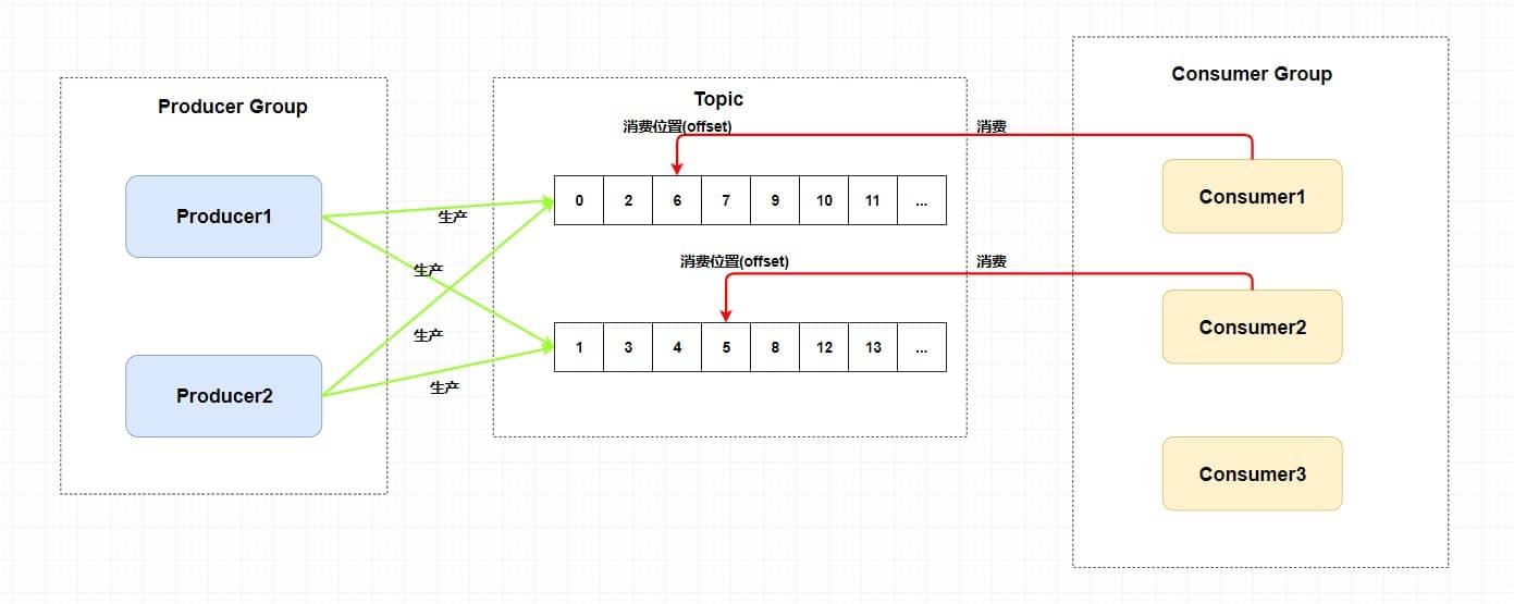 我们可以看到在整个图中有 Producer Group、Topic、Consumer Group 三个角色,我来分别介绍一下他们。