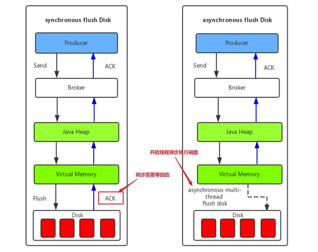如上图所示,在同步刷盘中需要等待一个刷盘成功的 ACK ,同步刷盘对 MQ 消息可靠性来说是一种不错的保障,但是 性能上会有较大影响 ,一般地适用于金融等特定业务场景。
