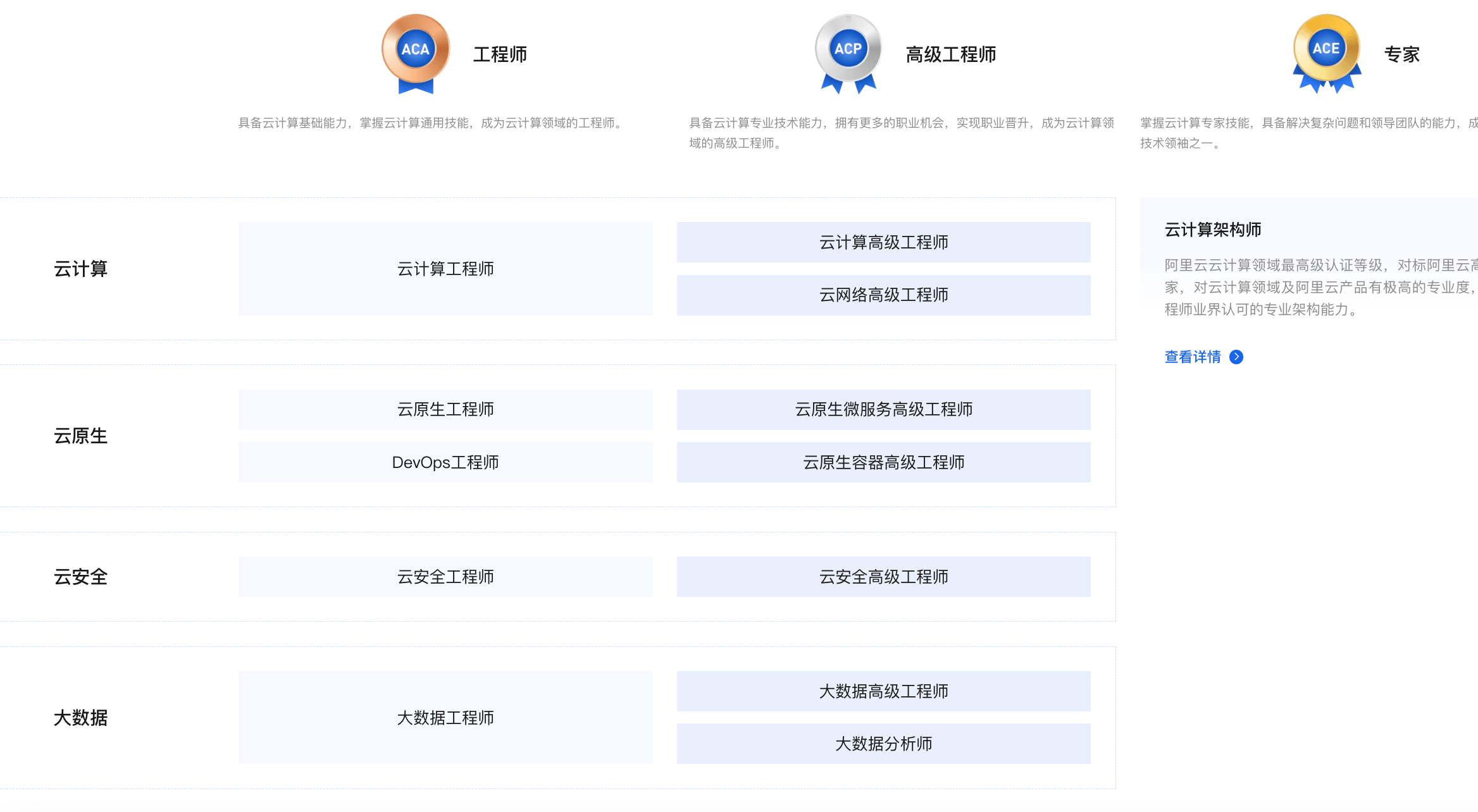 阿里云(Alibaba Cloud)提供的专业认证,认证方向包括云计算、大数据、人工智能、Devops 等。职业认证分为 ACA、ACP、ACE 三个等级,除了职业认证之外,还有一个开发者 Clouder 认证,这是专门为开发者设立的专项技能认证。