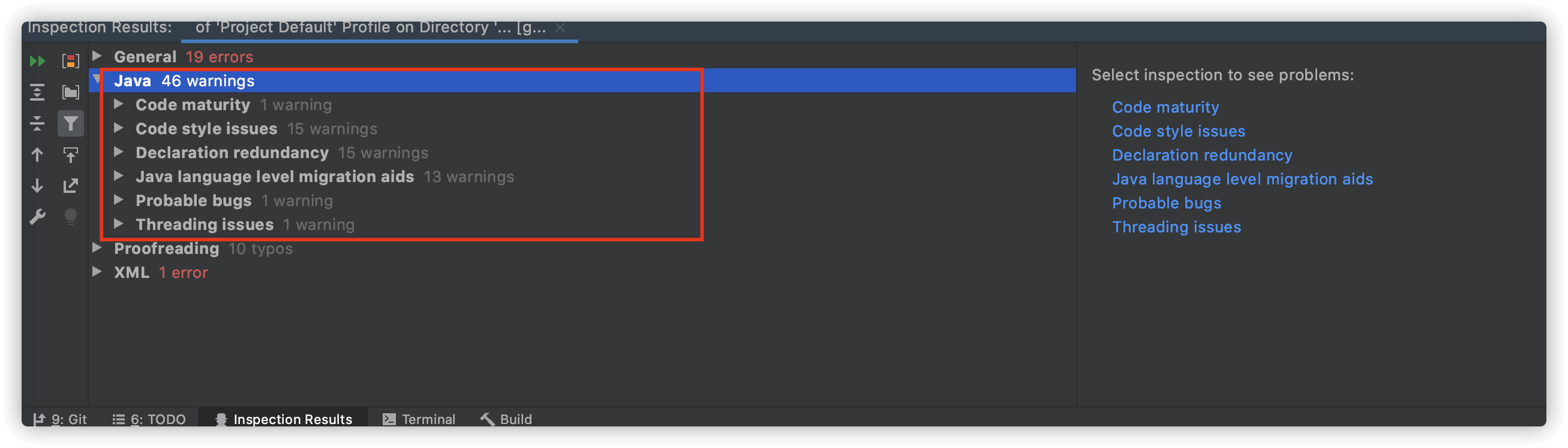 扫描完成之后,IDEA 会给出一些可能存在的代码坏味道比如命名问题。