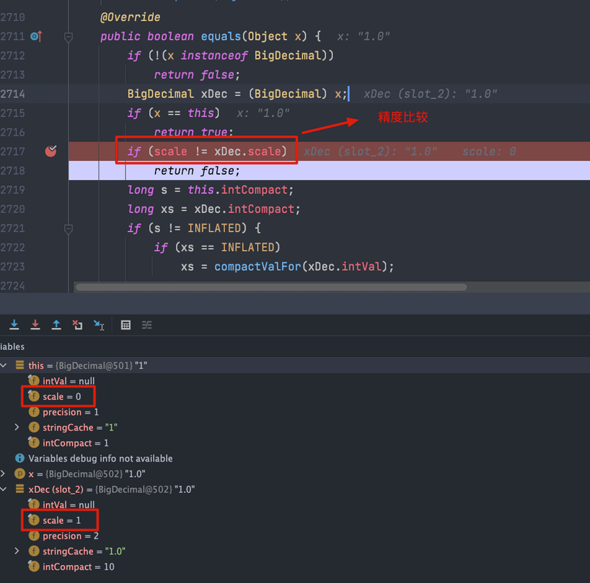 这是因为 equals() 方法不仅仅会比较值的大小(value)还会比较精度(scale),而 compareTo() 方法比较的时候会忽略精度。