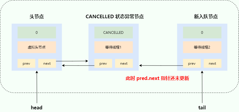 CANCELLED:如果一个节点在队列中等待获取锁锁时,因为某种原因失败了,该节点的状态就会变为CANCELLED,表明取消获取锁,这种状态的节点是异常的,无法被唤醒,也无法唤醒后继节点。