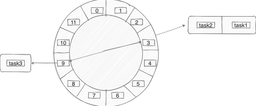 下图是一个有 12 个时间格的时间轮,转完一圈需要 12 s。当我们需要新建一个 3s 后执行的定时任务,只需要将定时任务放在下标为 3 的时间格中即可。当我们需要新建一个 9s 后执行的定时任务,只需要将定时任务放在下标为 9 的时间格中即可。