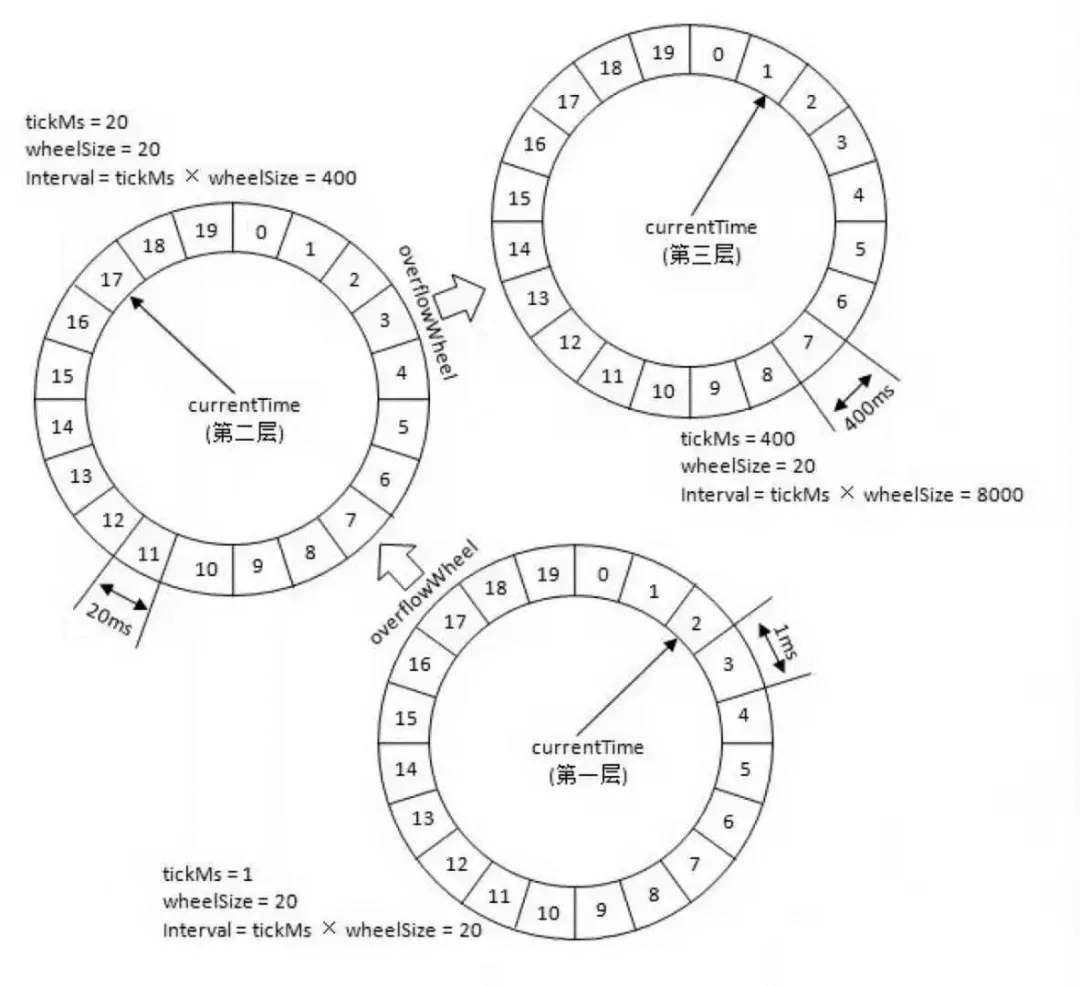 这里在层与层之间的移动也叫做时间轮的升降级。参考手表来理解就好!