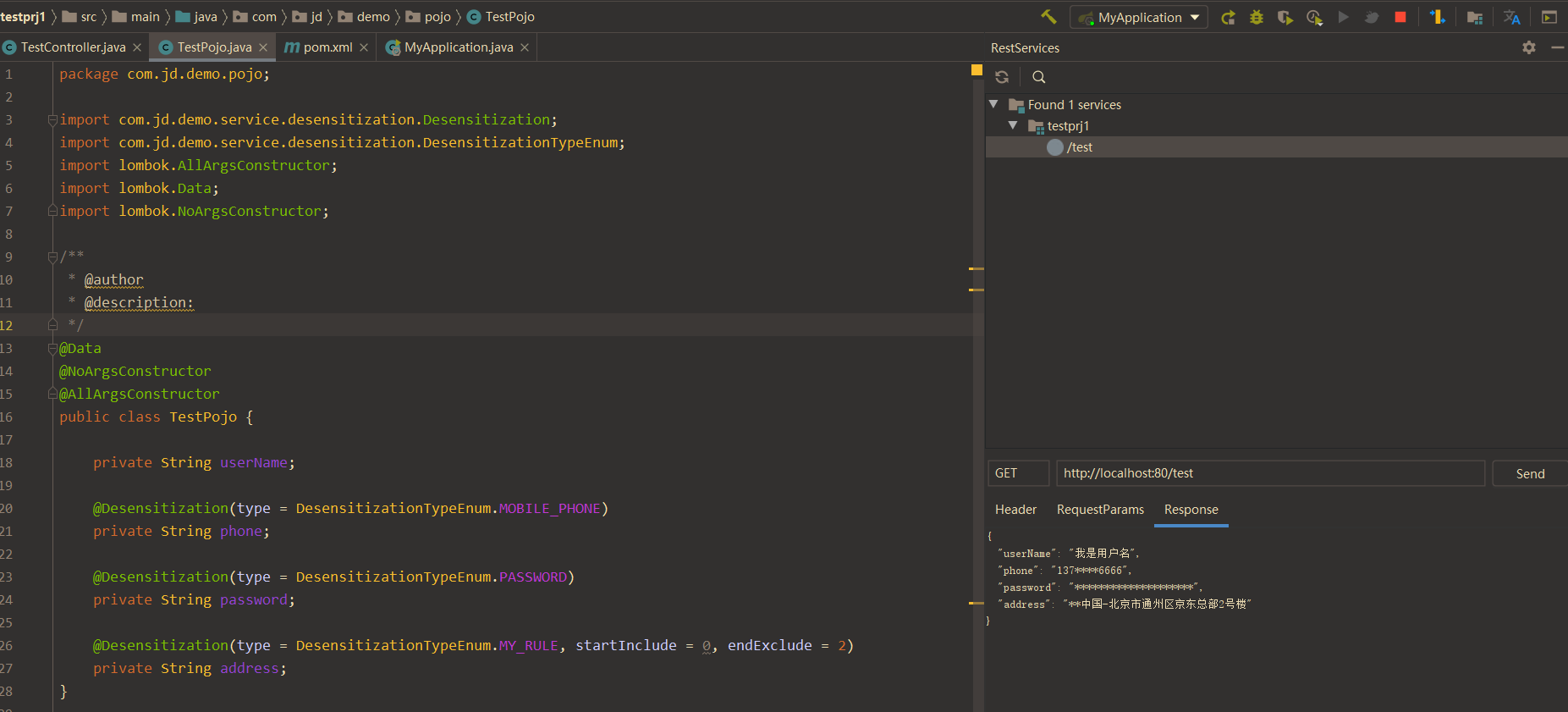 这里以手机号、银行卡号、身份证号、密码信息的脱敏为例,下面是对应的测试代码。