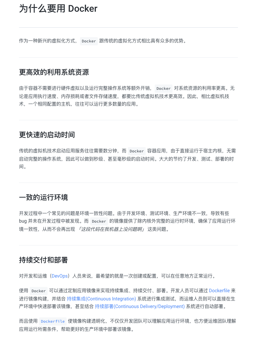 另外,《Docker 从入门到实践》 这本开源书籍中也已经给出了使用 Docker 的原因。