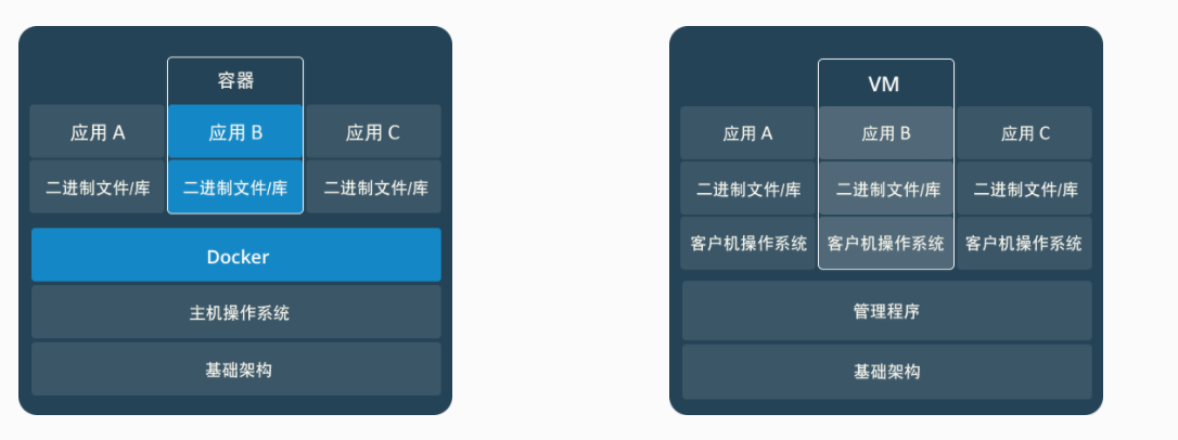- 轻量 : 在一台机器上运行的多个 Docker 容器可以共享这台机器的操作系统内核;它们能够迅速启动,只需占用很少的计算和内存资源。镜像是通过文件系统层进行构造的,并共享一些公共文件。这样就能尽量降低磁盘用量,并能更快地下载镜像。